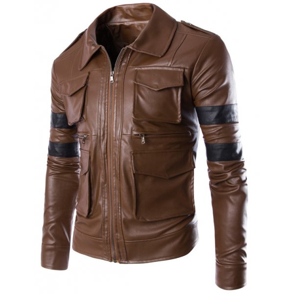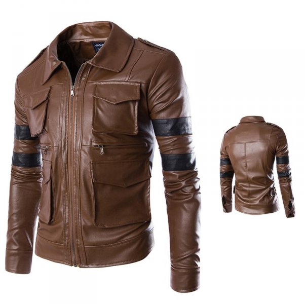 Give yourself the comfort and style of this Resident Evil Brown 4 Pocket Leather Jacket with Black Strip. Made with premium quality leather, this jacket is inspired by famous Series called Resident Evil. The beautiful cuts and stitches take its groovy look up a notch. It comes with the stand collar neck and a zipper at the front. There are brown panels on both shoulders and matching buttons on the cuffs. 2 pockets at the waist and 2 on the chest make it a unique design in leather jackets market. Black strips on the sleeves gives it a hip look but keeps it classy at the same time.